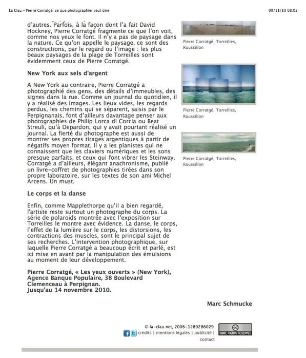 La mer, la mer, toujours recommencée... Que Valery (Paul pas Giscard) me pardonne. Les oeuvres de Pierre Corratgé exposées sur ies cimaises de la galerie Thérèse Roussel évoquent la profondeur des poètes. Pourtant... Le cadre est simple pour ne pas dire simpliste : la mer et le ciel, saisis toujours au même endroit, un bord de plage de Torreilles. se partagent en parts égales le tableau, (tableau, le mot caractérise bien les photos). De cet univers minimaliste, au fil du temps et des prises de vues, Corratgé fait rejaillir un océan de couleurs, de lumières, de nuances, de densités. Les quelque 60 photos (L'artiste confie en avoir pris plus de mille, toutes aussi riches et variées), suspendues côte à côte , font percevoir l'étendue de la beauté du monde dans lequel on vit. L'étendue de sa diversité et surtout, par défaut, de nos ignorances, de l'abîme infini de tout ce que notre regard, et nos sens, n'ont pas encore saisi et qu'il reste à capter. La contemplation renvoie à un autre poème, de Verlaine, celui-la (on ne quitte pas les Paul): "je fais souvent ce rêve étrange et pénétrant d'une femme inconnue et que j'aime et