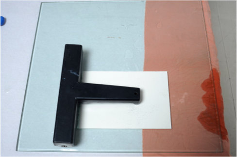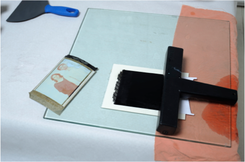 Après avoir repéré le côté le plus lisse du papier (en haut) on le trempe dans la cuvette 30 sec dans de l'eau à 25-30°C, puis on le pose sur le verre, on enlève l'excès d'eau par un passage — léger — du rouleau ou de la raclette.